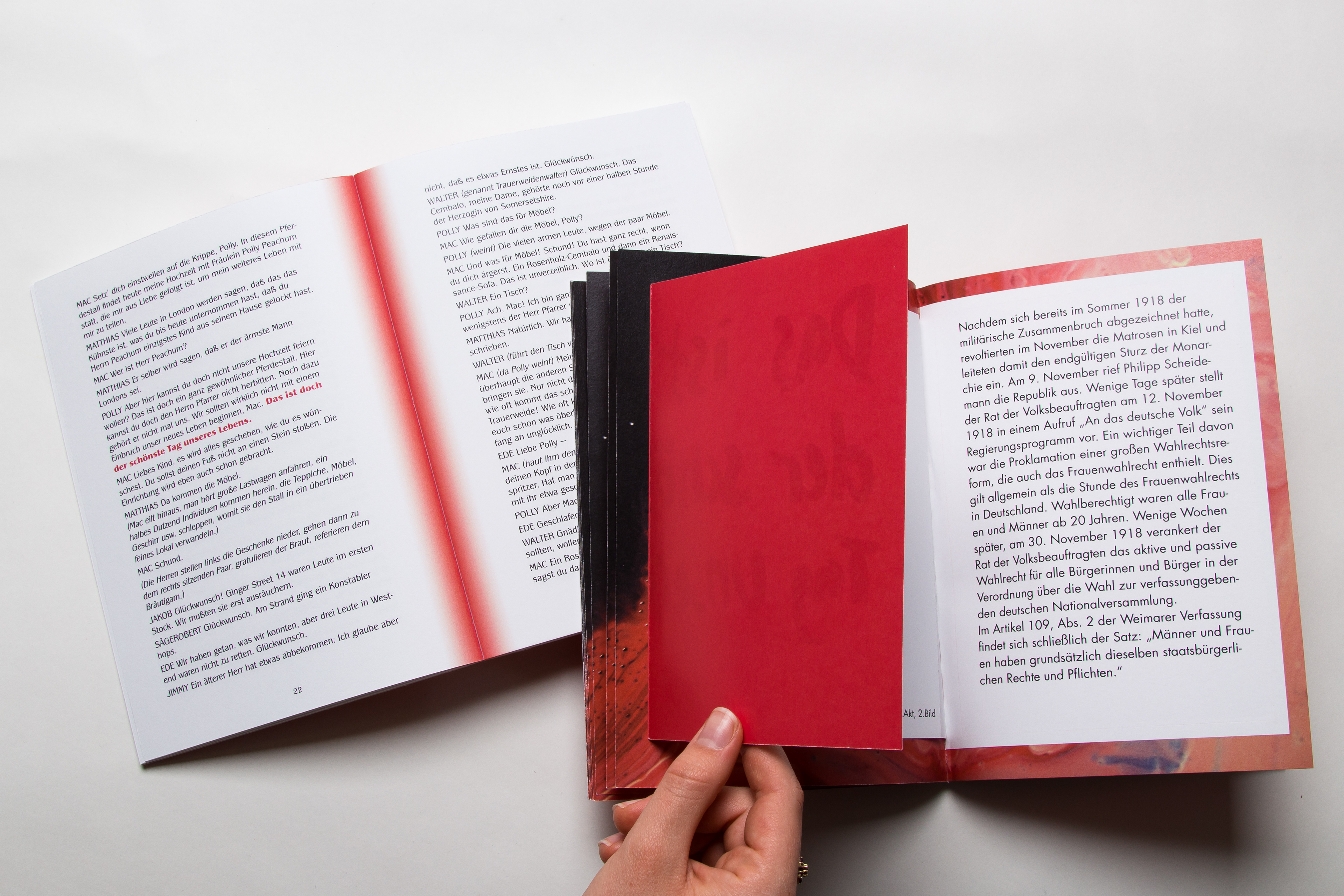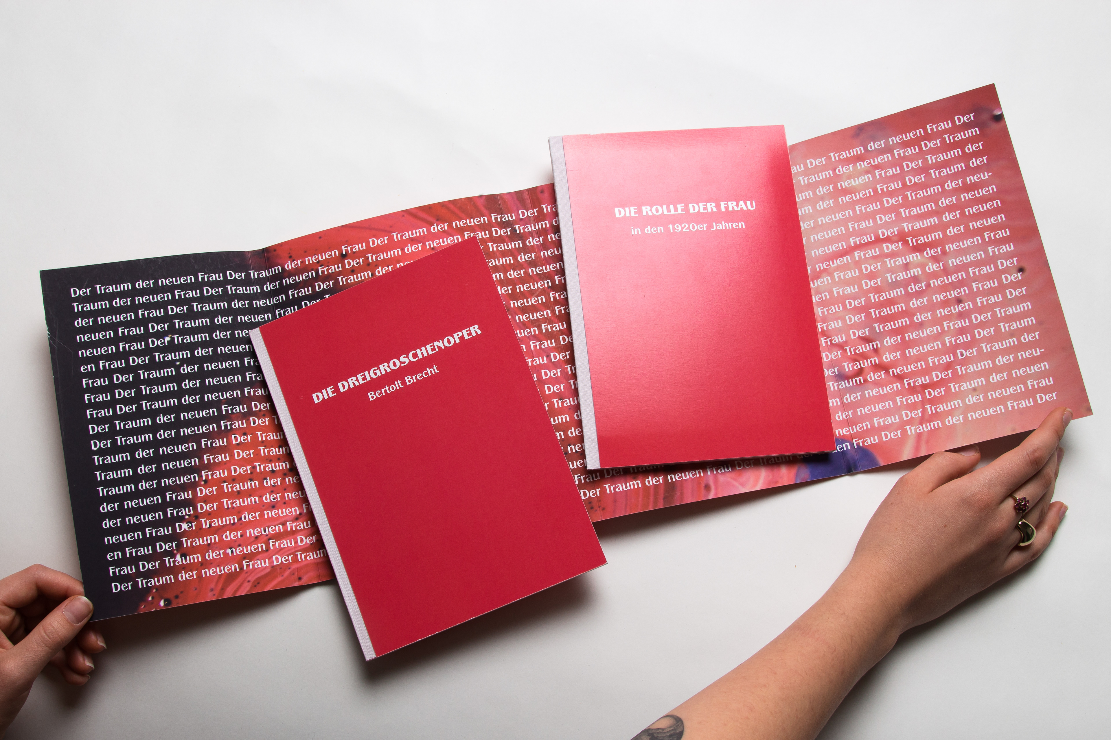 In this project I made a opera companion book for the very famous Threepenny Opera by Bertold Brecht. It is separated in two books: The first one shows the text from the first edition. A few quotes are marked. The second book explains the role of woman in the 1920s. Referring to the first book you find a short explaining text to every marked quote. Therefor I covered topics like divorce, election authority and dependence of the woman to the man.